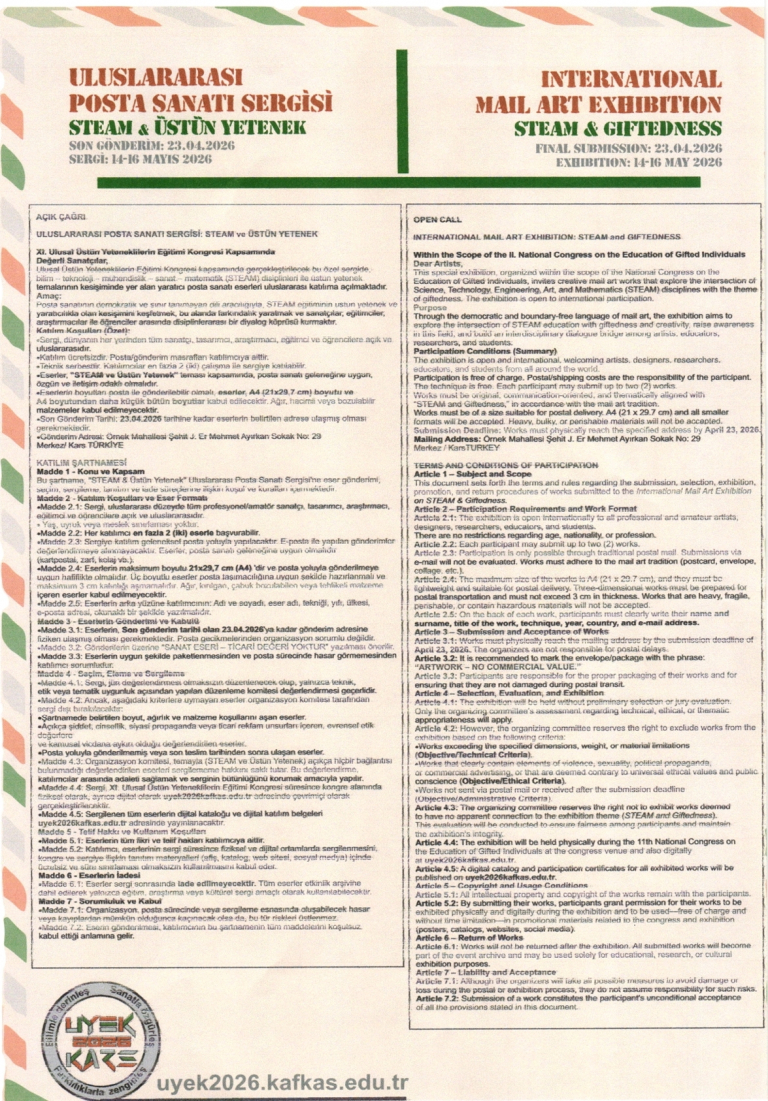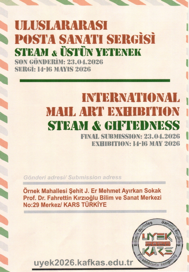 XI. Ulusal Üstün yeteneklilerin Eğitimi Kongresi çalışmaları kapsamında düzenlenecek olan Ululslararası Mail Art Sergisine ait duyuru afişi ektedir.