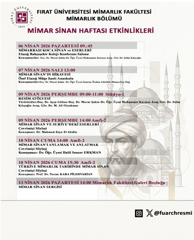 06-13 Nisan 2026 tarihleri arasında bölümümüz tarafından Mimar Sinan'ı anma etkinlikleri gerçekleştirildi.